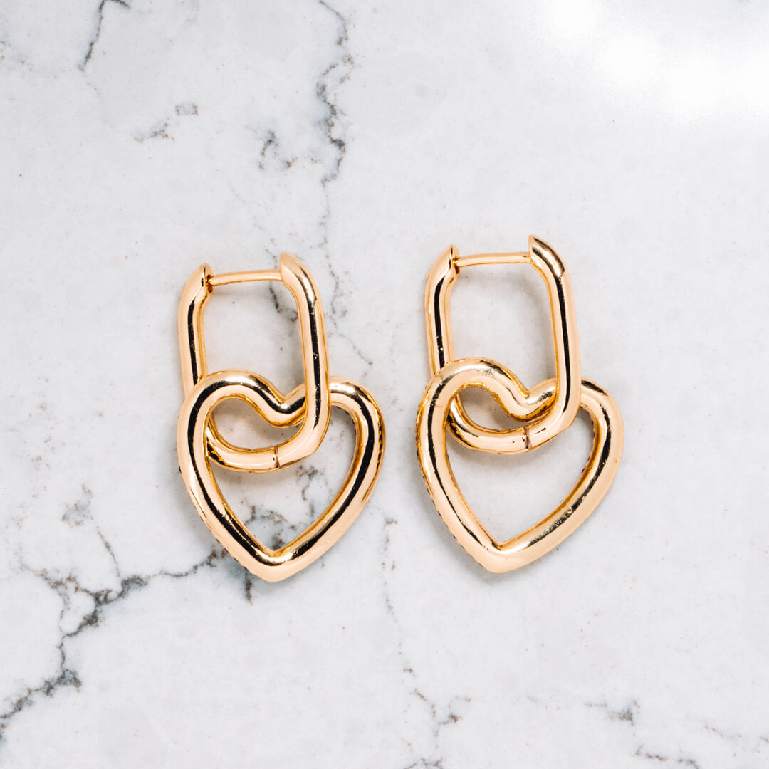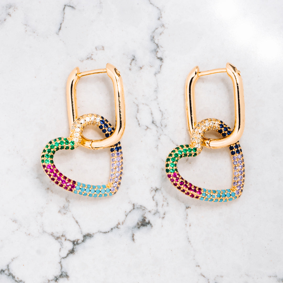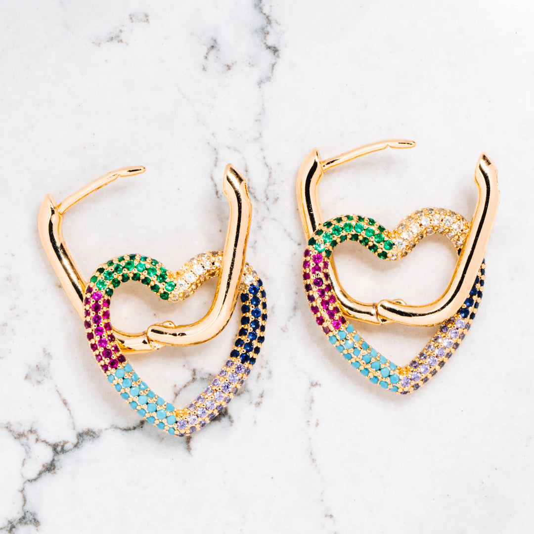 A super versatile pair of heart-shaped gold tone earrings with multi-coloured stones.