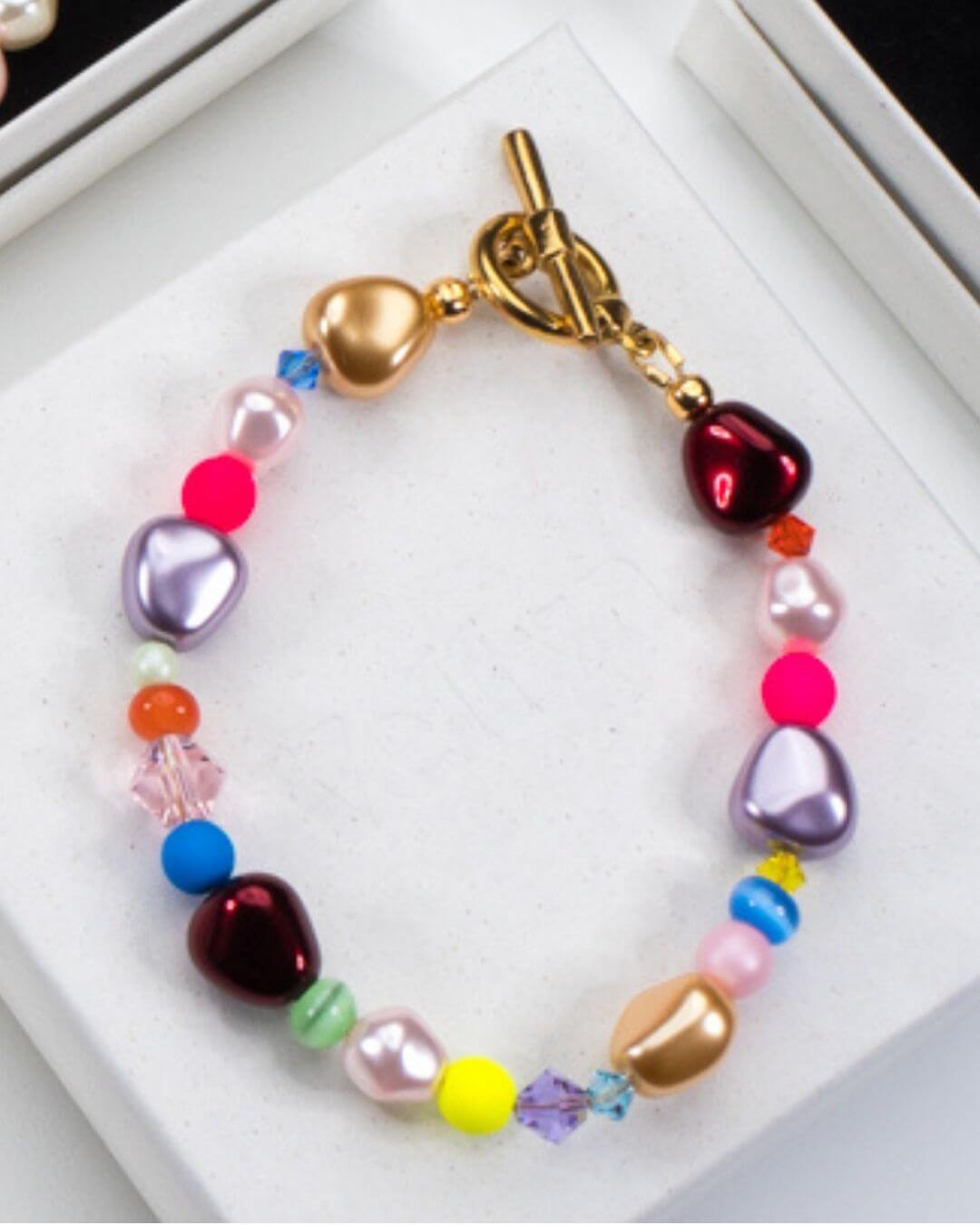 - Mixed baroque vegan crystal pearls*, cat's-eye beads, crystals, glass beads, 18k gold plated stainless steel toggle clasp.